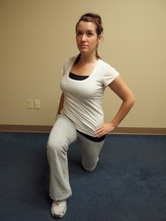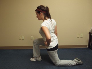 Kneel directly on the leg you want to stretch with your other leg forward with your foot on the floor. Put your hand on your hip, elevate chest and tuck in abdominals. Slowly push hip forward until you feel the stretch in the front of your leg. Slightly rotate in opposite direction. Hold for ______ seconds. Repeat ______ times a day. This stretch can also be done while standing.