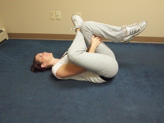 Lay on your back on the floor. Interlock fingers around one knee. Bring toward your chest. Release and repeat on the opposite side. Follow by pulling both knees at the same time to your chest. Repeat in each position for ______ seconds ______ times a day.